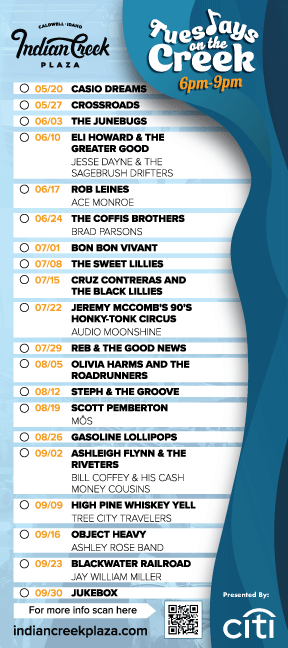 Spend your Tuesday nights on the Creek in downtown Caldwell. This 20-week event series includes live music from both local and touring artists. Each week we curate for you talented and engaging musicians sure to get you up off your seat and dance with your special someone.